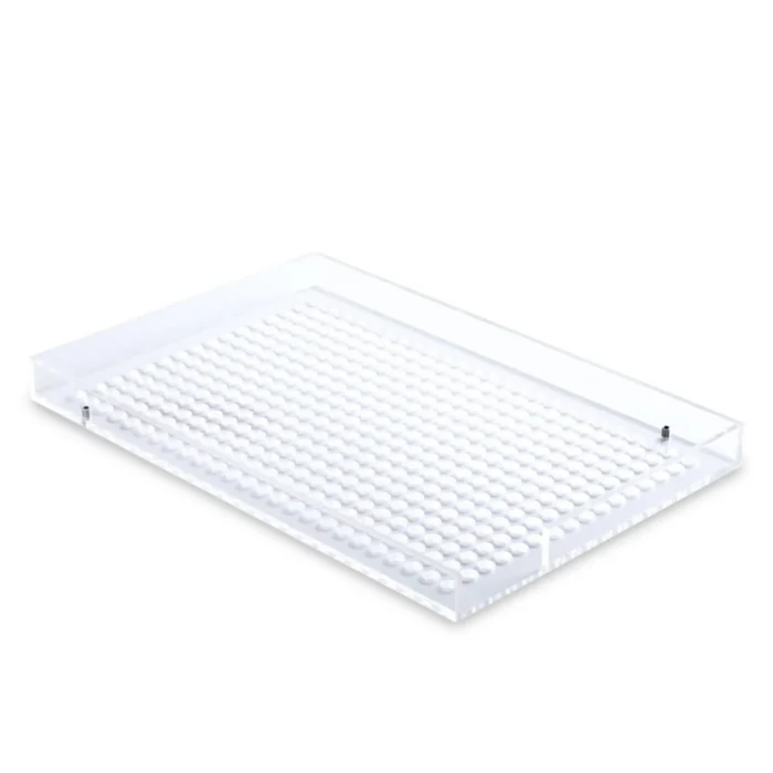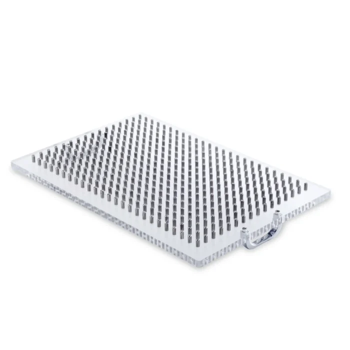 Ce modèle est taillé pour l’endurance. Le châssis est usiné dans un bloc d’acrylique haute densité, garantissant une rigidité totale même sous forte pression. Les ressorts de rappel, la visserie et les picots de tassement sont fabriqués en acier inoxydable (Inox 304) résistant à la corrosion et compatible avec les protocoles de nettoyage en laboratoire.